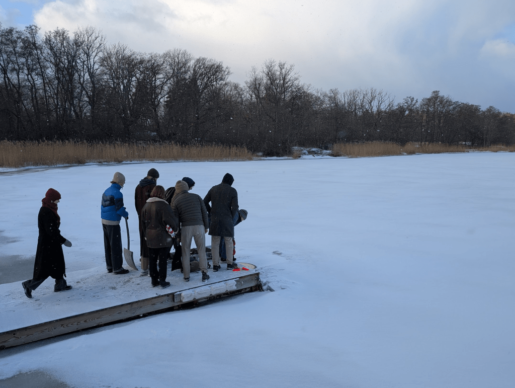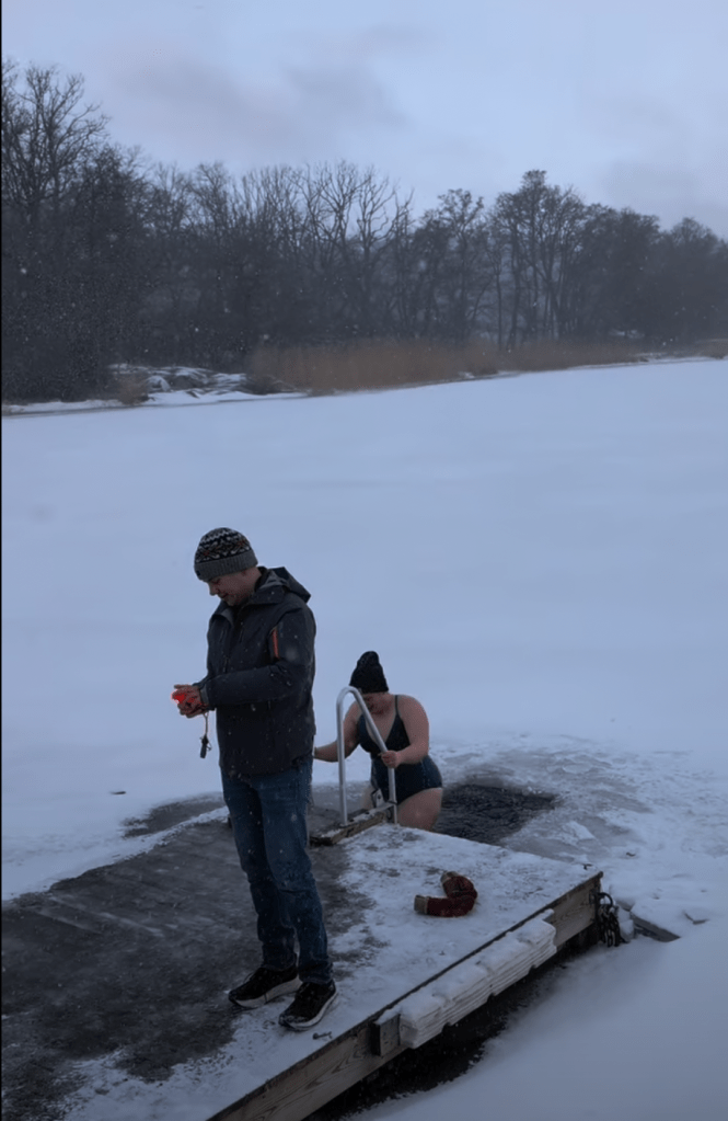 One weekend in February my choir had a rehearsal weekend at Bogesundslandets Nature Reserve just outside of Stockholm. We spent most of the weekend rehearsing the music for our concert in March but we had a couple of hours on Saturday to relax and enjoy the area. About 20 of us decided to use that time to go ice bathing! This is a very Swedish activity but this was also the first time many of my Swedish friends were trying it. You cut a person-sized hole in the ice (sometimes with a chain saw) right next to the dock where you can easily get in and out with a ladder. Then you gather your courage, strip down to your bathing suit, and lower yourself into the freezing cold water. You don’t stay in for long but you can give yourself a few seconds to adjust and try to keep breathing. Then you climb out and, ideally, head straight into the sauna. Unfortunately for us, there was no sauna here. We climbed out, toweled off, and struggled to get back into a few layers of warm clothes with completely numb fingers. It is definitely refreshing and really does make you feel good once you’re warmed back up. The water seems scary but after I got undressed I was so cold and numb from the air that the water really wasn’t any worse (and was maybe even better). Getting dressed was very difficult as my feet were frozen solid and my fingers were fully numb and not really working properly. By the time we walked back to the conference center I was almost fully warmed back up again.
