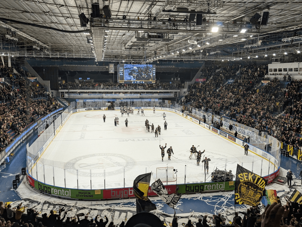 After we tried our hands (and skates) at playing ice hockey, it was time to let the professionals show us how it’s done. In the beginning of February I went to an ice hockey game with some friends. This was a derby match between two second division Stockholm teams: AIK and DjurgÃ¥rden. These two clubs are considered “twin teams” because they were both founded in 1891 in Stockholm and they also have a soccer rivalry. Because this was a derby, the arena was entirely filled with AIK supporters. I think this was the first time I’ve been to a sports match with fans from only one team. This meant that every time the opposing team (DjurgÃ¥rden) scored, there was no reaction from the crowd and the only real way you could tell they got a point was by watching the scoreboard. The crowd was absolutely wild and they had some really fun songs and chants. The energy was electric. AIK scored eight goals so there was a lot of celebrating. It was a passionate, chaotic, fun game and AIK (my new favorite second division Swedish hockey team) beat DjurgÃ¥rden 8-4!